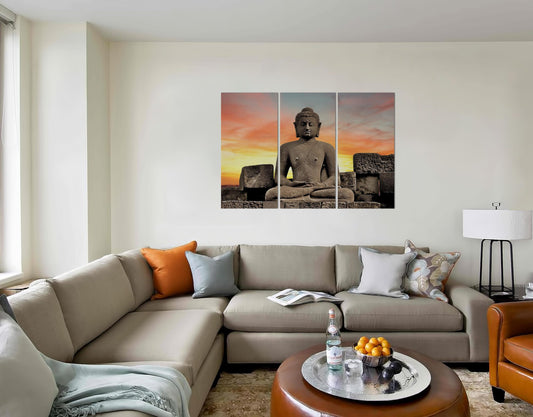 Peaceful Lord Goutam Buddha Stone Art with Sunset Wall Canvas Print