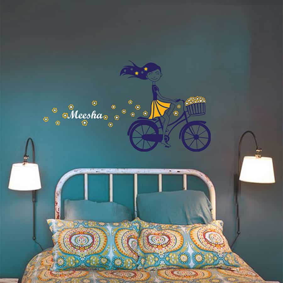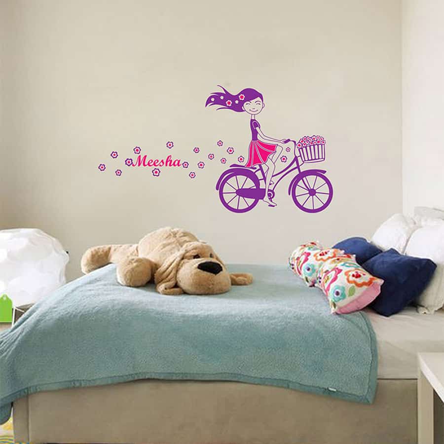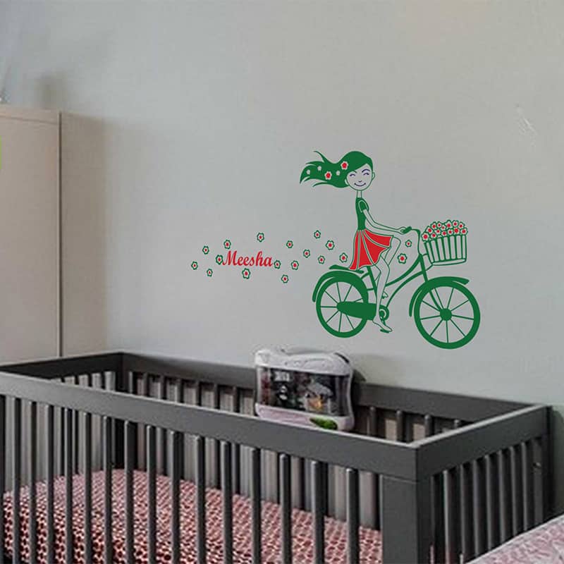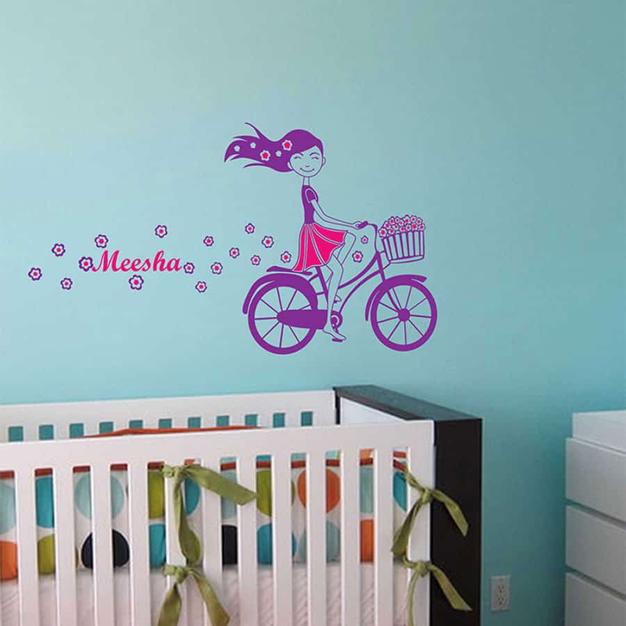 This charming design of a girl riding a bicycle gives a fresh feeling to your daughter's room with colours, flowers & cool breeze blowing in. Personalize with her name to make your daughter really love her space.