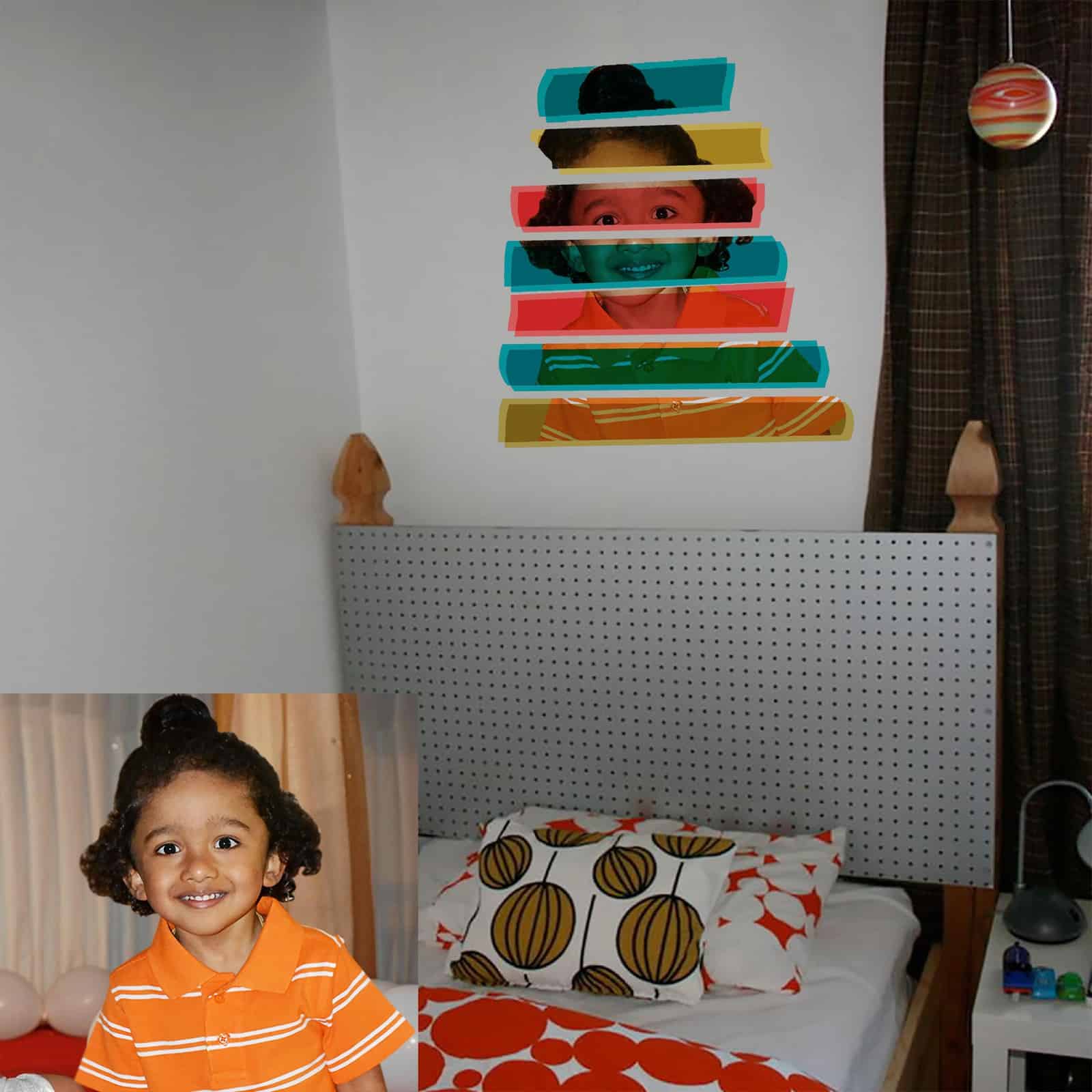 Customize your kids room with a pop style photograph sticker. Make a great birthday gift for boys & girls that parents will love too. As a room decor personalized gift the colourful pop effect will surely make the kid's photo wall popular among all family members.The window slit style photo sticker with bright colour effects is best on a wall, above a table, behind a bed backdrop or on a furniture too. This design is available in Transparent Vinyl Sticker which when stuck, will blend with the colour of the wall or door. Hence, recommended for light coloured surfaces only.The cut in-between the photo will not cut out the main features of the face. We will send you the best design option preview before we print it for you.