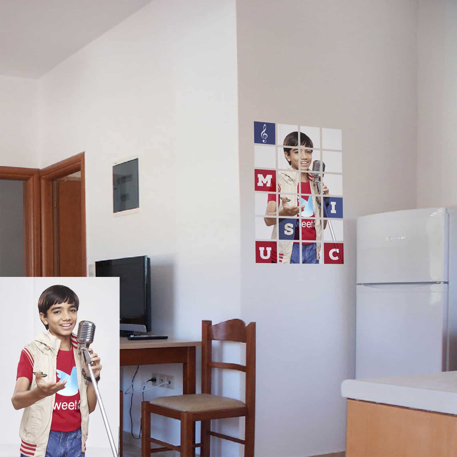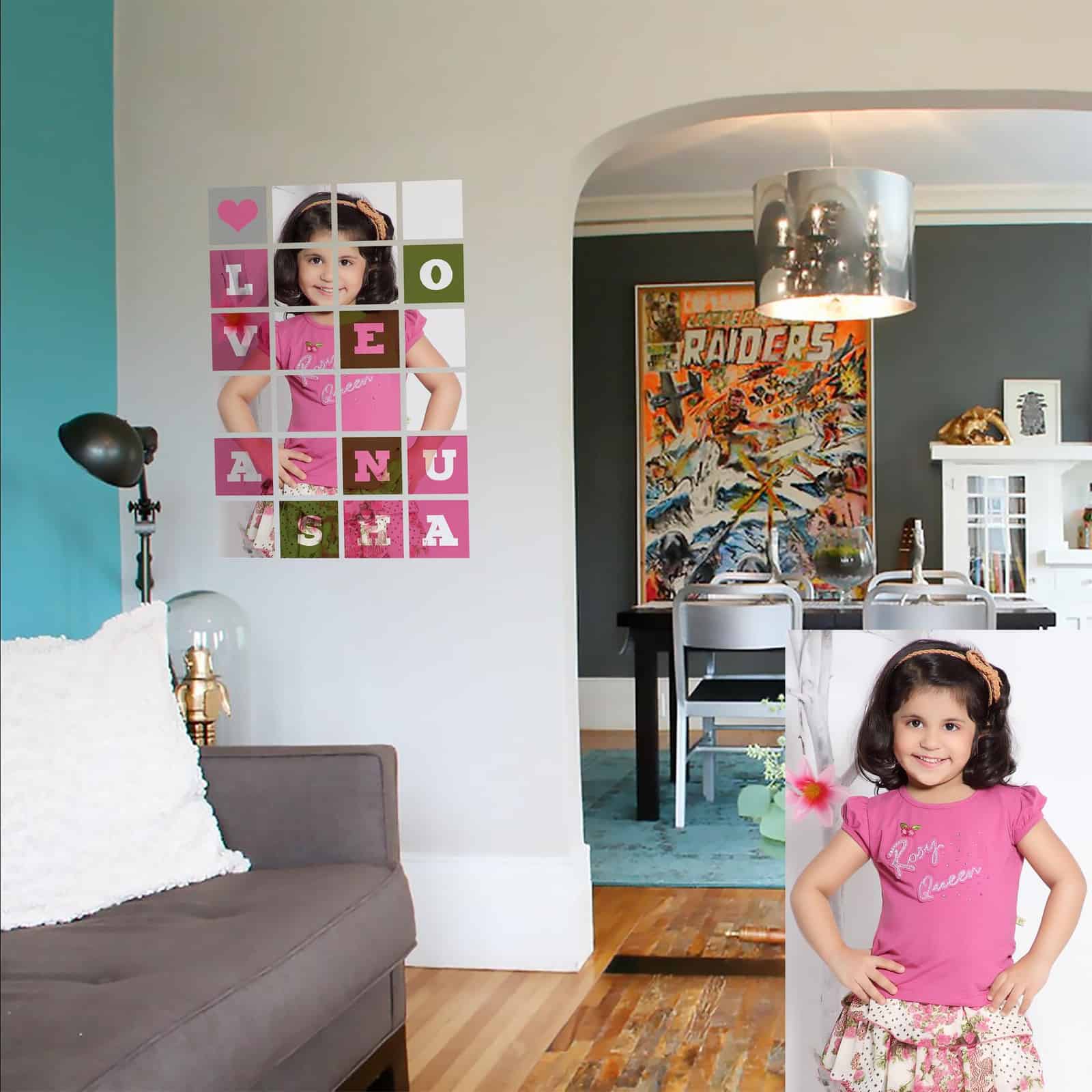 Create a personality photo sticker. The design is cut in squares which allows you to add letters within these squares to make a descriptive poster about anyone. Let us know the words you want on the sticker squares. Ideal number of letters is 10 for 2ft by 1.5ft, 16 for 3ft by 2ft, 24 for 4ft by 3ft and 30 for 5ft by 4ft.Each square is separate and hence blends with the wall. This poster is ideal to gift your close friends or family members. You can make a family photo collage also in landscape and add words to describe each family members' eccentric and likable character traits & interest.So go ahead, create a personality photo sticker - gift your loved ones a descriptive wall poster.