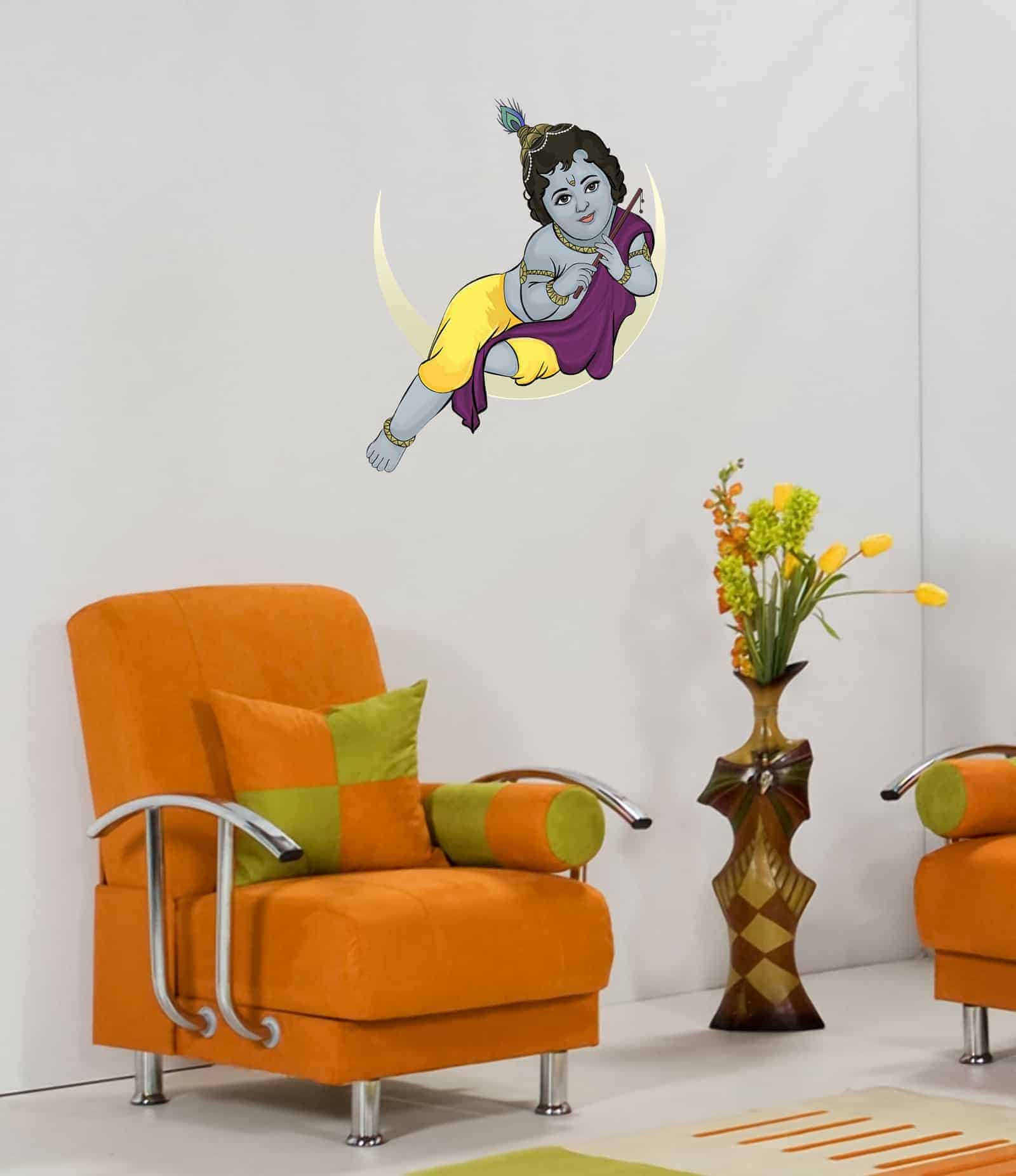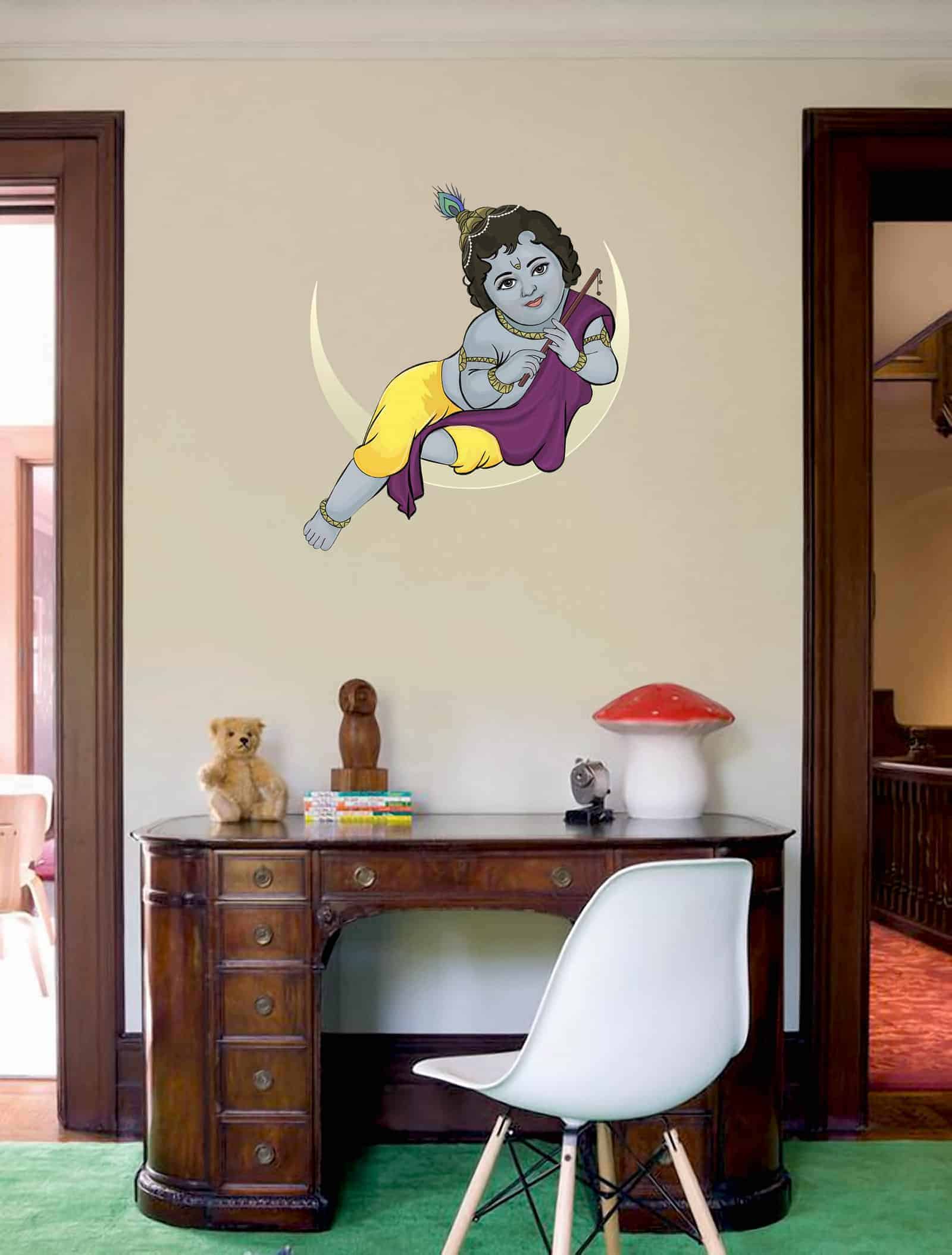 Baby Krishna Painted looks splendid sitting on the moon and playing the flute. The mesmerizing wall sticker can be stuck on any smooth surface.