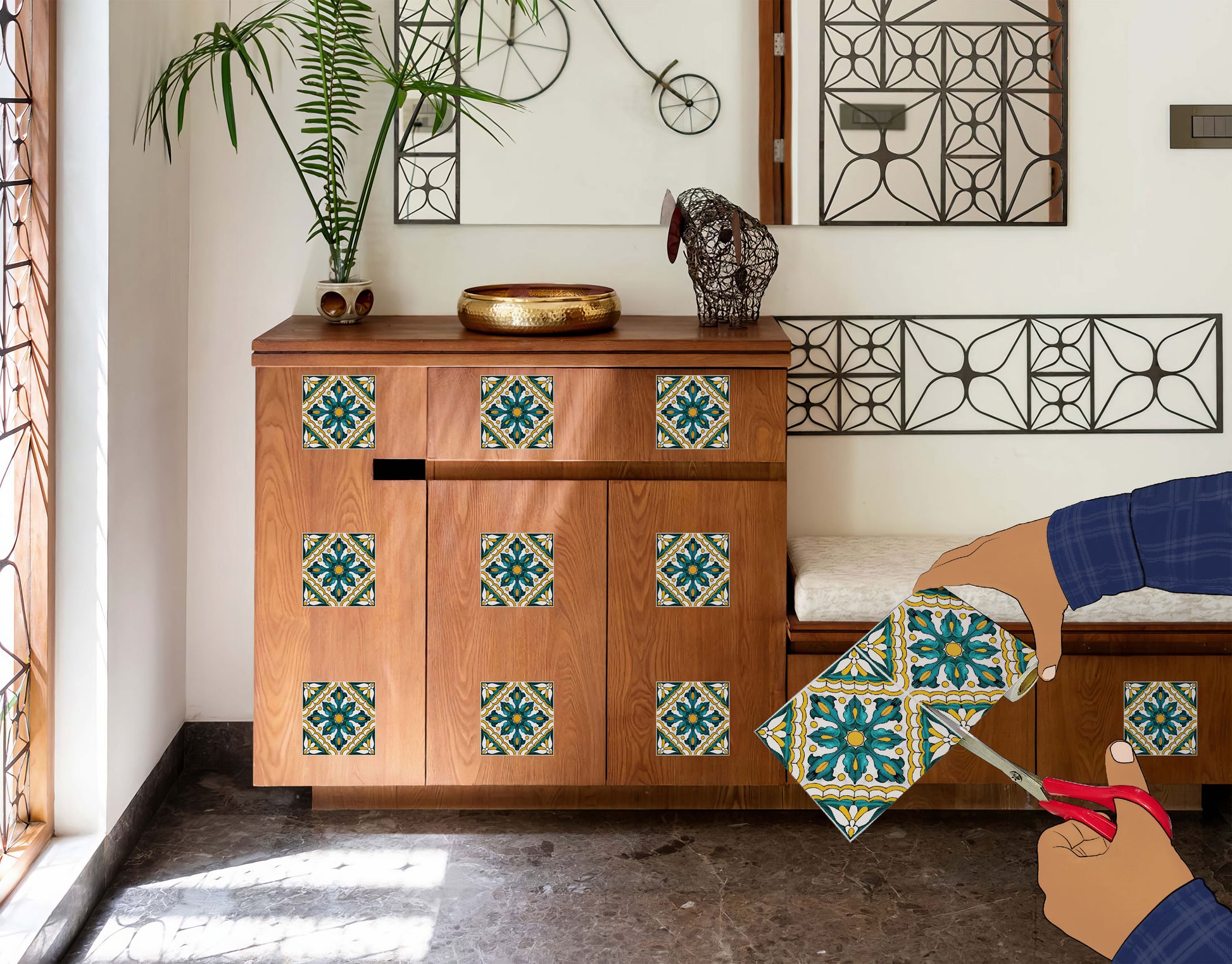 Blue Lemon Pansy Tile Sticker Self-Adhesive Stickers for Cupboard, Door, Cabinet, Furniture, Table, Glass, Wall